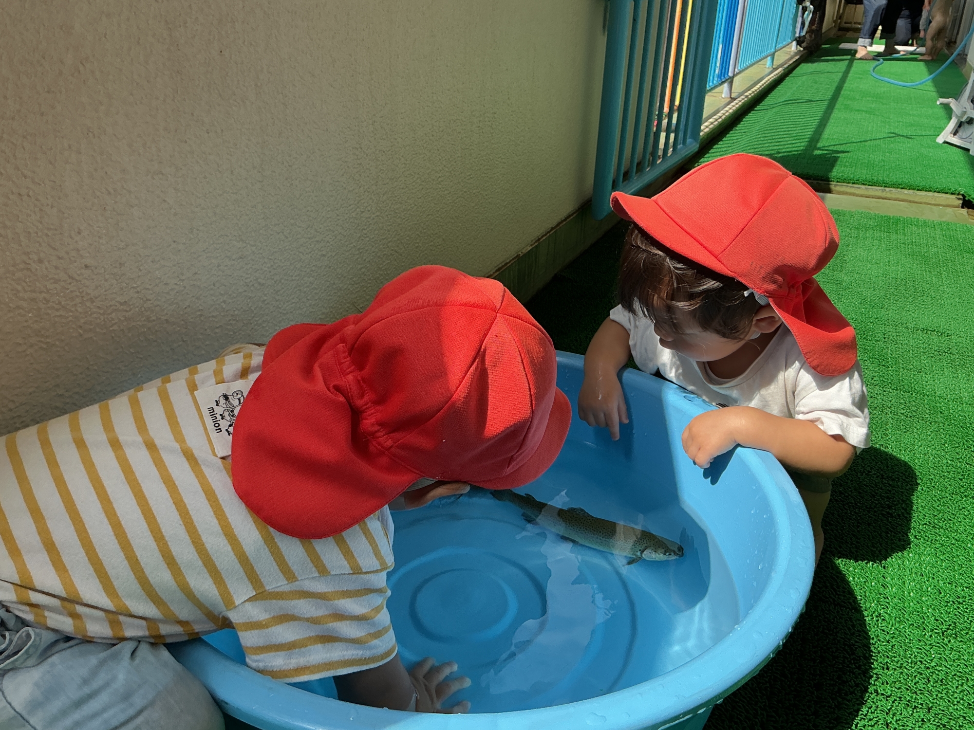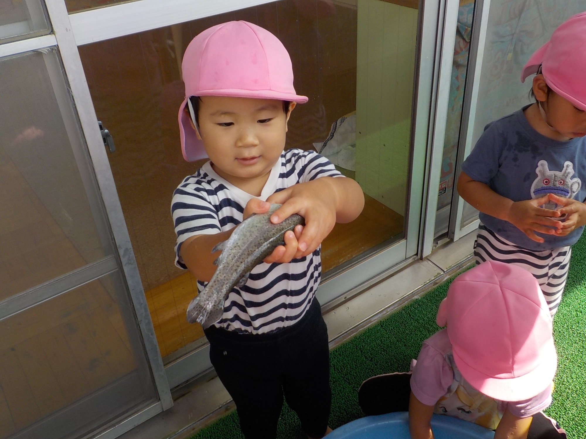 お部屋のベランダでタライにマスを入れてふれあい体験です。